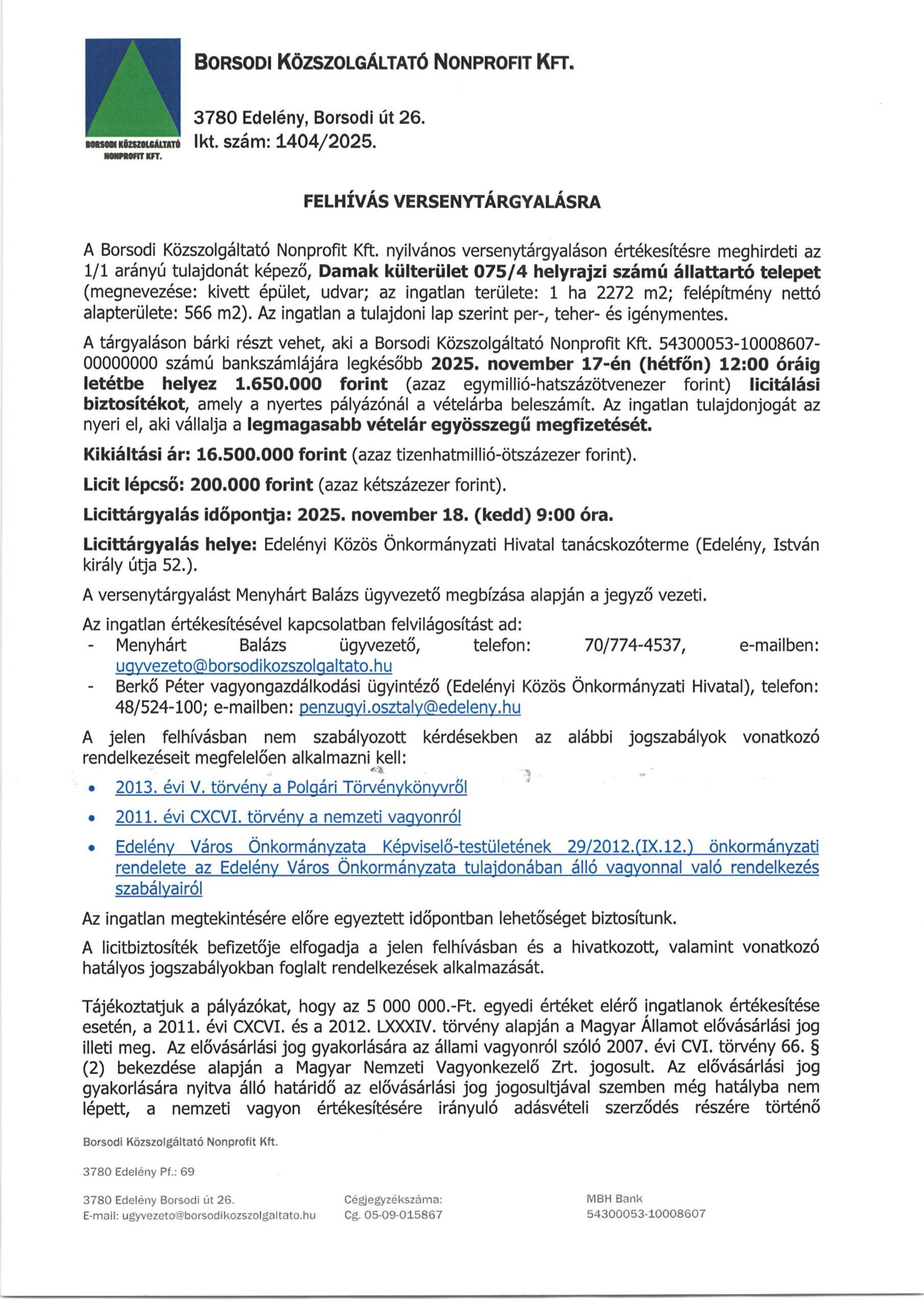 A Borsodi Közszolgáltató Nonprofit Kft. nyilvános versenytárgyalást hirdet egy Damak külterületén fekvő, 1 ha 2 272 m²-es állattartó telep (566 m² felépítmény) értékesítésére.