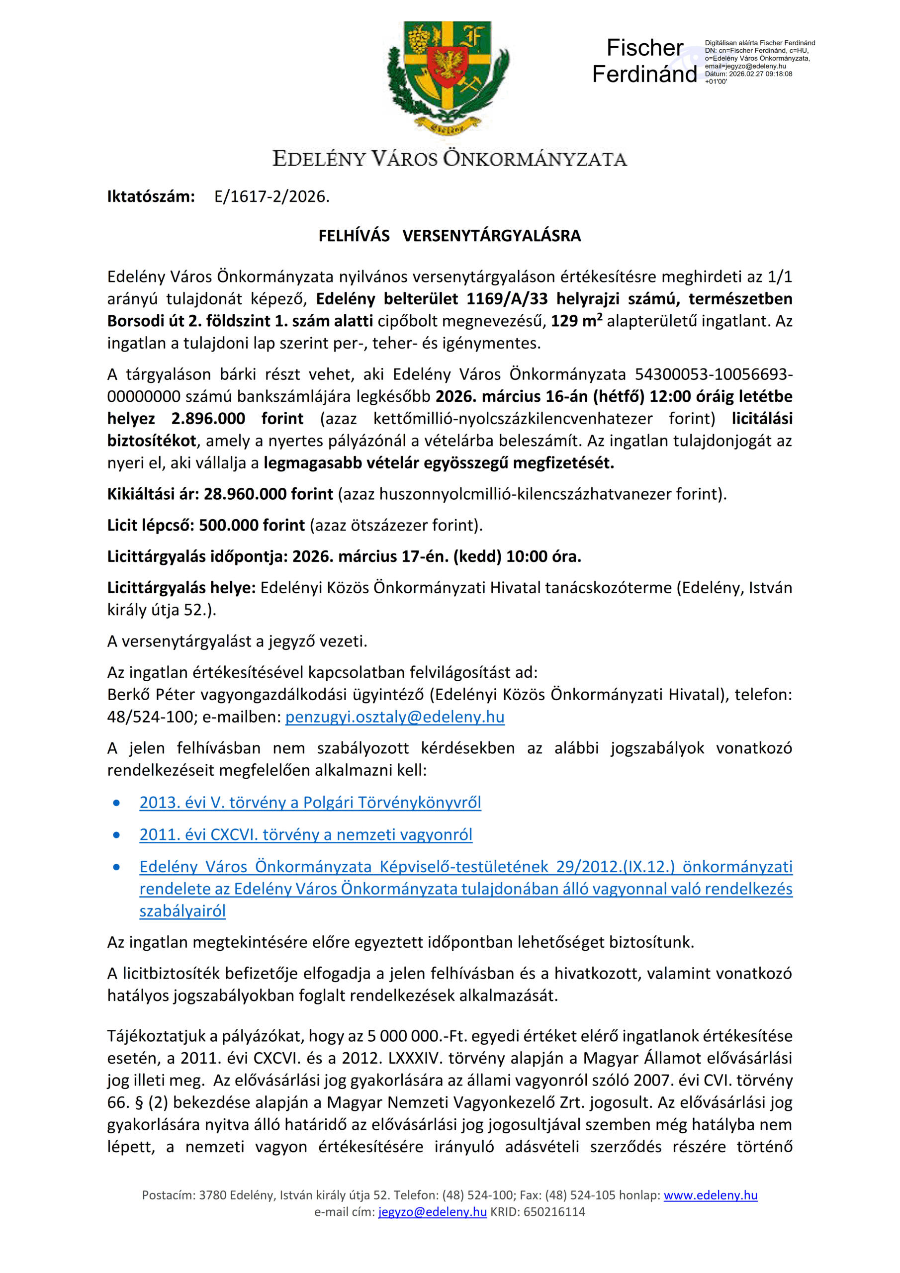 Edelény Város Önkormányzata nyilvános versenytárgyaláson értékesítésre meghirdeti a Borsodi út 2. szám alatti, 129 m2-es üzlethelyiséget (hrsz.: 1169/A/33, „cipőbolt”). Az ingatlan per-, teher- és igénymentes, megtekintésére előzetes egyeztetés után van lehetőség.