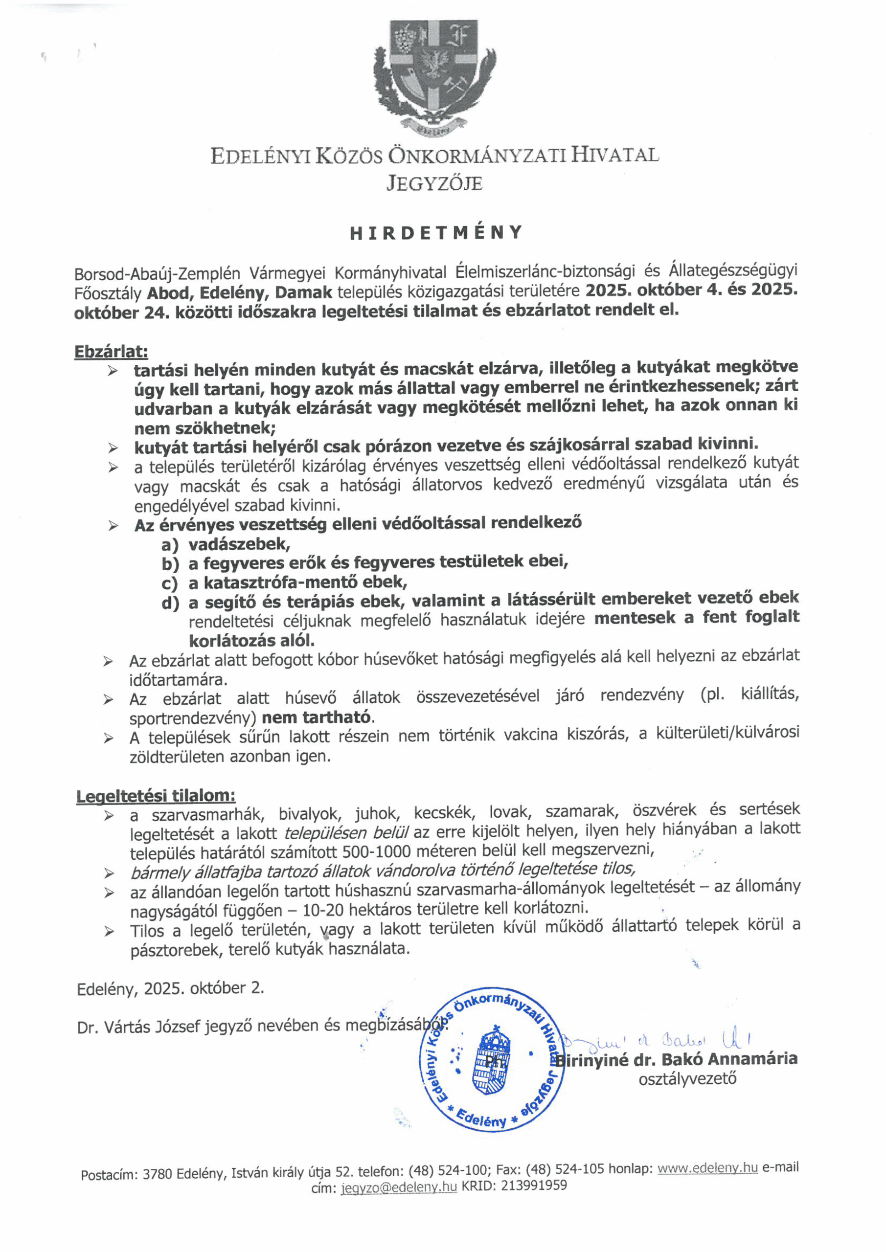 Edelény, 2025. október 2. ️ Birinyiné dr. Bakó Annamária, osztályvezető Dr. Vártás József jegyző megbízásából