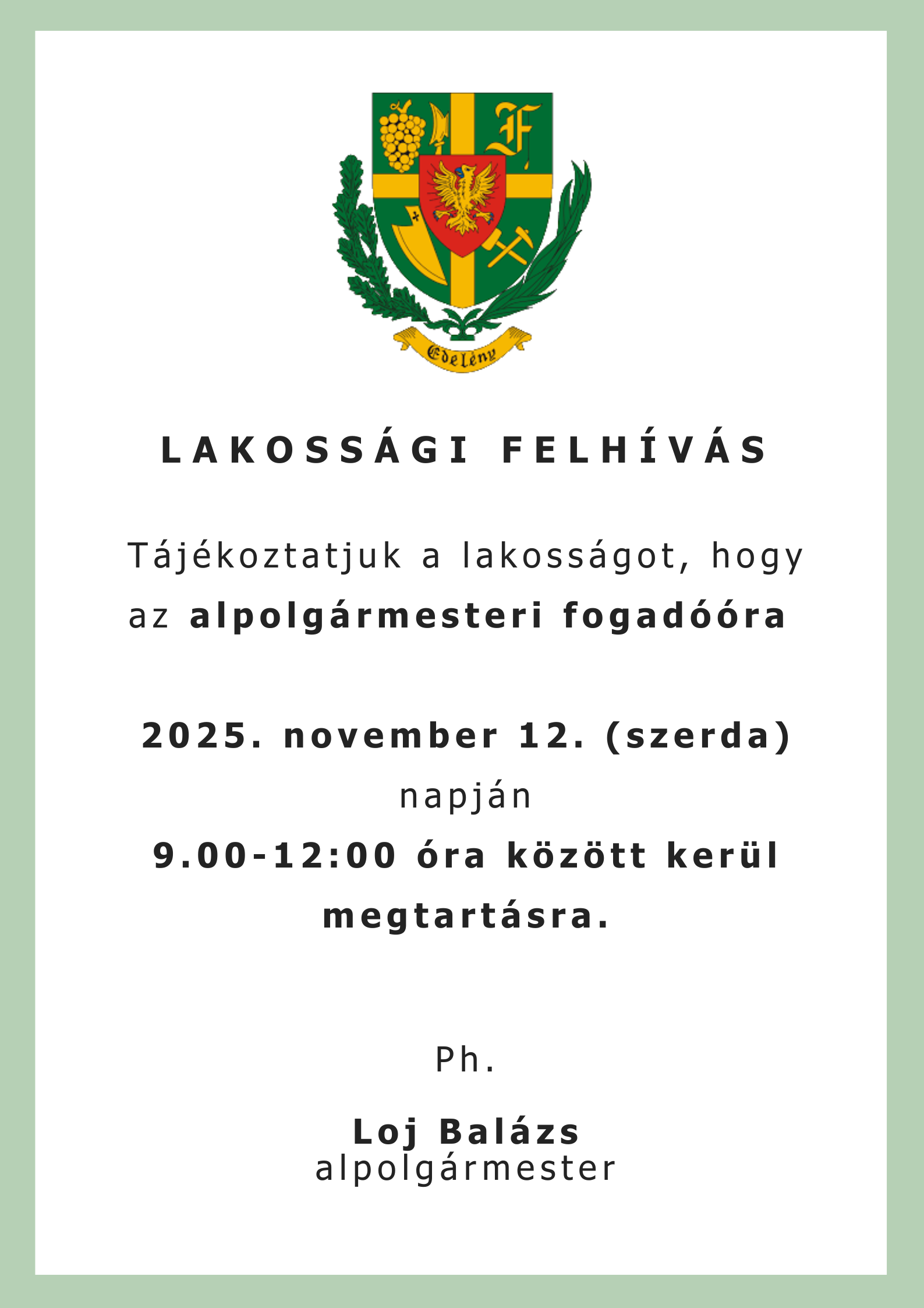 Ezúton értesítjük Önöket, hogy Loj Balázs alpolgármester úr személyesen várja Önöket egy fogadóórára, ahol közvetlenül oszthatják meg észrevételeiket, javaslataikat és kérdéseiket. A fogadóórára 2025. november 12-én (szerda) 9.00 – 12.00 óra között kerül sor a polgármesteri hivatalban.