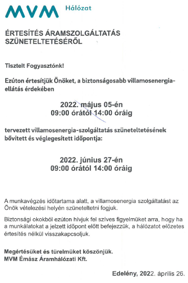 Tervezett villamosenergia-szolgáltatás szüneteltetéséről